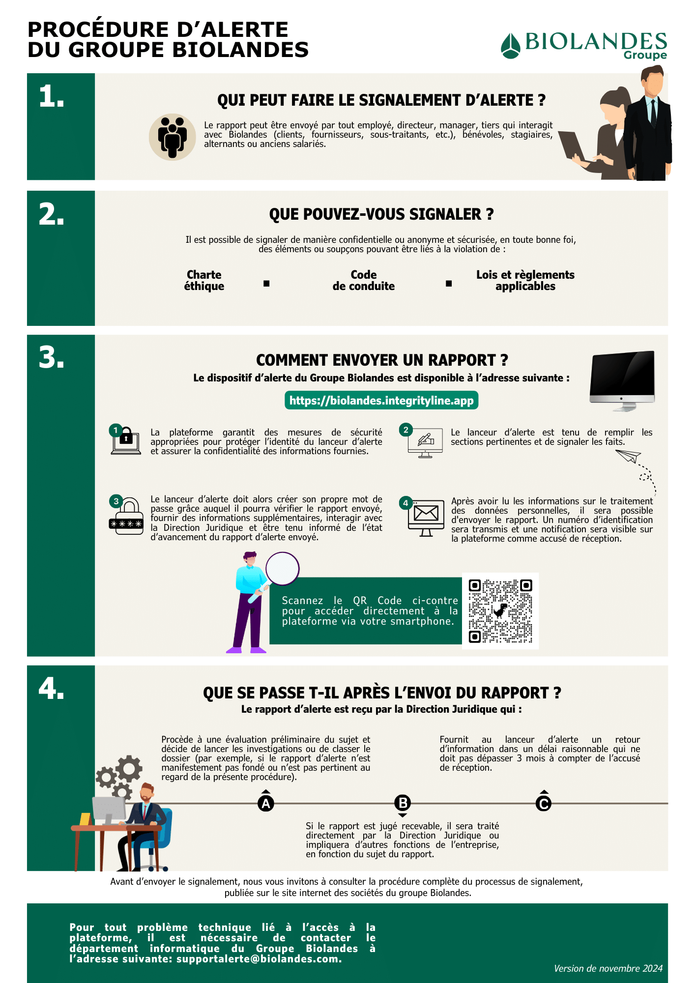 Vous trouverez les documents concernant le code de conduite anti corruption et la procédure d’alerte groupe Biolandes en téléchargement au format PDF sur cette page.